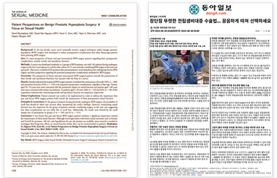 - 동아일보“전립선 비대증에는 다양한 수술 방법이 있기 때문에 수술 전 정확한 정보를 제공하고 환자의 상황과 니즈에 맞는 수술 방법을 제안하는 것이 중요하다.”