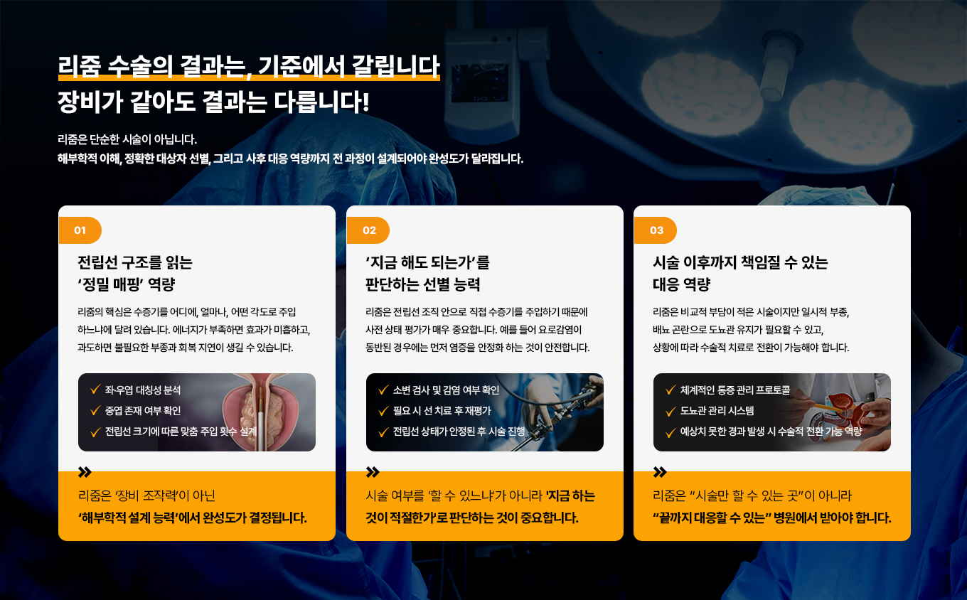 리줌 시술은 같은 장비를 사용하더라도 결과가 달라질 수 있습니다. 전립선 내부에 수증기를 주입하는 위치와 횟수, 각도 등을 환자의 전립선 구조에 맞게 설계해야 하기 때문입니다. 또한 전립선염이나 요로감염 등 다른 문제가 동반된 경우에는 바로 시술을 진행하기보다 상태를 먼저 안정시키는 판단이 필요할 수 있습니다. 시술 후 일시적인 통증이나 도뇨관 관리, 경과 관찰까지 이어지는 과정도 중요하므로 전립선 상태를 종합적으로 평가하고 시술 이후까지 관리가 가능한 병원인지 확인하는 것이 도움이 됩니다.